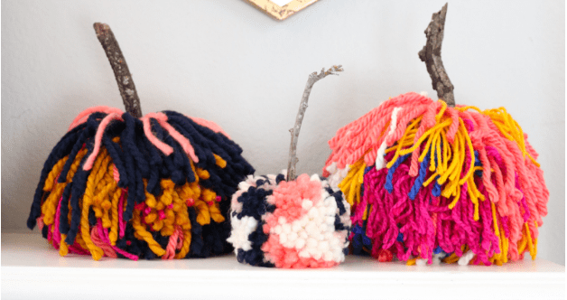 Another great DIY home decoration activity for you and your kids is Pom Pom Pumpkins. These colorful yarn Pumpkins will last much longer than one season and will look great on your desk or mantlepiece!