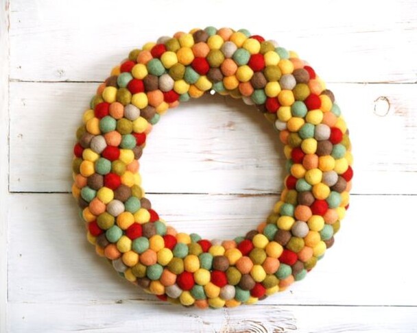 By gluing a bunch of felted balls or pom-poms in a circular shape the end result is instant door decor! Choose fall colors that'll pop against your door, such as red, orange, and yellow.